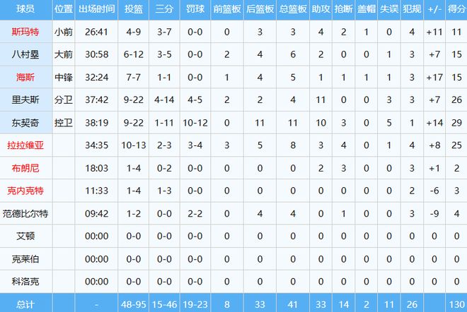 東契奇貢獻29分11板10助三雙,里夫斯26分11助兩雙到手,拉拉維亞25分進賬,合計80分。